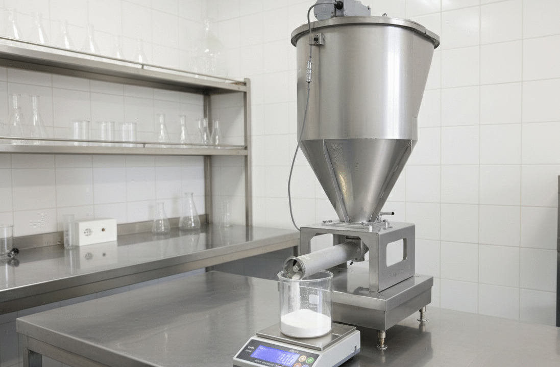 - Low bulk density powders trap air easily, leading to unstable feeding.